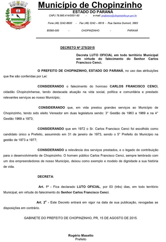 A Prefeitura Municipal de Chopinzinho lamenta com profundo pesar o falecimento do Ex-prefeito do município de Chopinzinho, Sr. Carlos Francisco Cenci, ocorrido na noite de sexta-feira (14/08). Figura ilustre e de grande estima pela sociedade chopinzinhense, Carlos Francisco Cenci, administrou o município de Chopinzinho de 1973 a 1977, tendo exercido anteriormente dois mandados junto ao Legislativo Municipal. Desse modo, o município de Chopinzinho se irmana à família enlutada diante da imensurável dor e inestimável perda, ao tempo em que declara luto oficial de três dias no município.